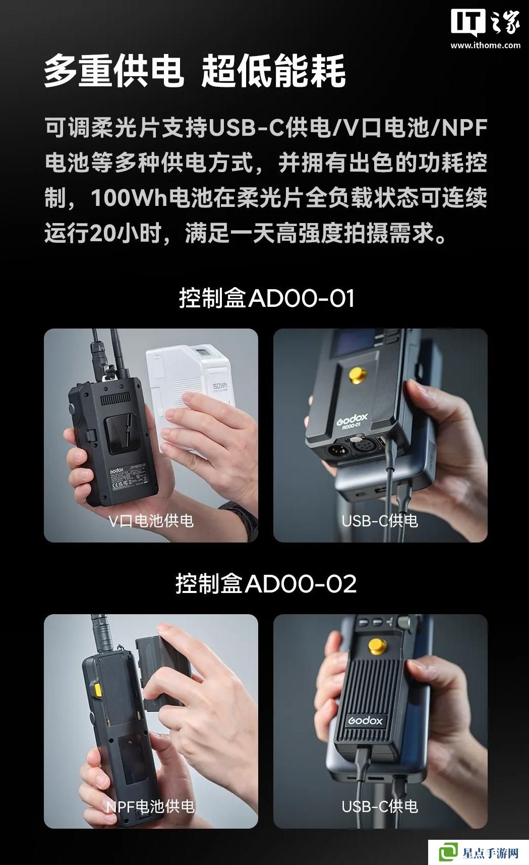 在供電方面,該系列可調柔光片擁有 USB-C 供電、V 口電池和 NPF 電池等多種供電方式,根據(jù)官方介紹,使用 100Wh 的電池在柔光片全負載狀態(tài)下可連續(xù)運行 20 小時,可滿足一天的高強度拍攝需求。
