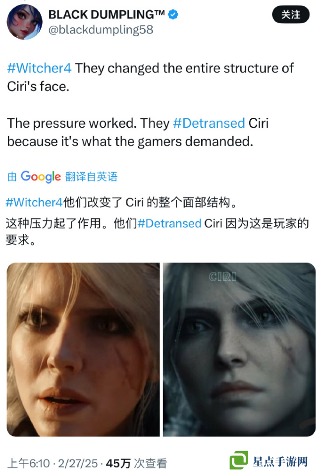 本站 3 月 3 日消息,CDPR 在TGA 2024 上首次公布了《巫師 4》的游戲預告片,前三部的主角杰洛特退場,希里成為新一代主角。然而,該預告片中展示的希里臉部造型引起了部分玩家吐槽。