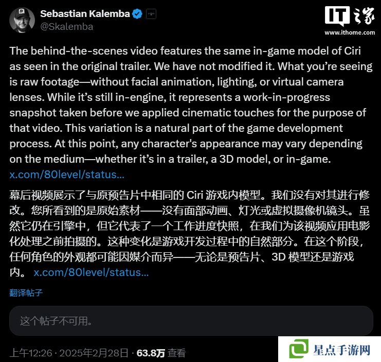 然而,《巫師 4》游戲?qū)а?Sebastian Kalemba 對這一猜測進行了否認,他在 2 月 28 日發(fā)文表示,幕后視頻展示了與原預告片中相同的希里游戲內(nèi)模型。官方?jīng)]有對其進行修改,玩家所看到的是原始素材 —— 沒有面部動畫、燈光或虛擬攝像機鏡頭。