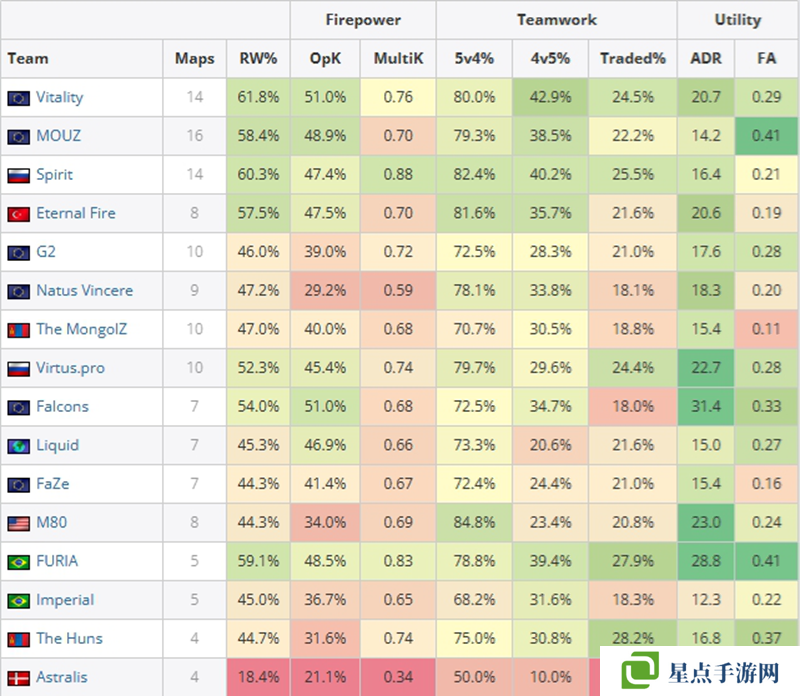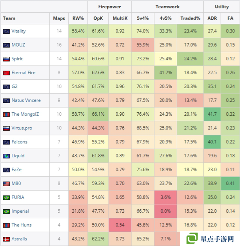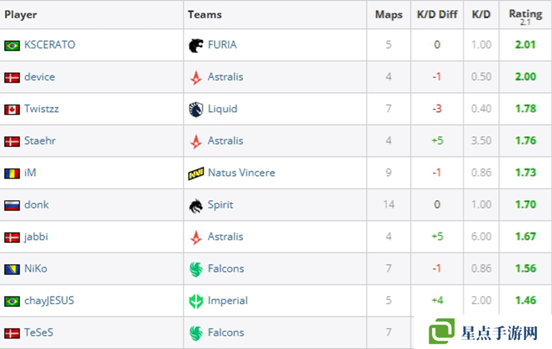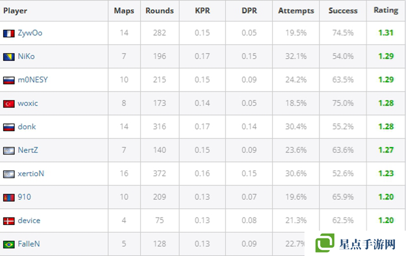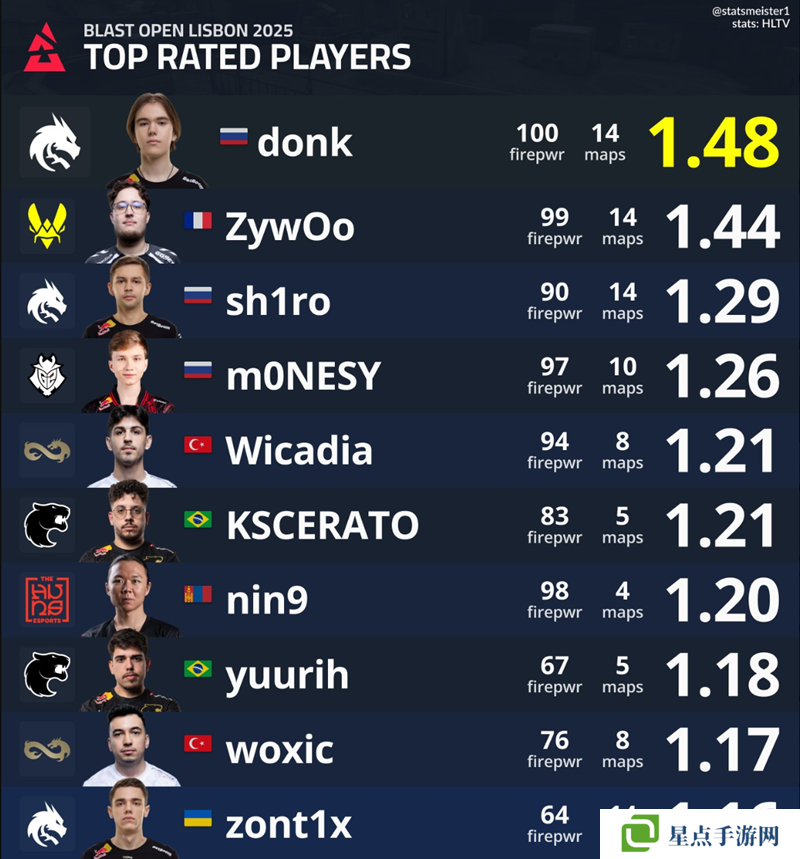 第一名是donk,他在14張地圖上有著1.48的rating,同時(shí)他有著100的火力值。第二名是賽事MVP ZywOo,他在14圖有著1.44的rating。第三名是sh1ro,14圖有著1.29的rating。