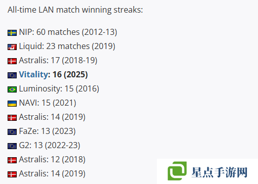 Liquid(23場)和2018-2019年的Astralis(17場)。而Vitality只要再贏一場就可以追平Astralis,目前看來,這對(duì)他們并不是什么難事。