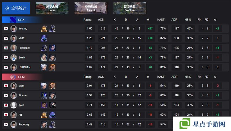 圖一蓮華古城13:3,圖二亞海懸城13:8 ,DRX直落兩盤輕取DFM,小組賽取得兩連勝。此役free1ng選手表現(xiàn)出色,拿到全場最高的45總擊殺,全場ACS來到了驚人的318。
