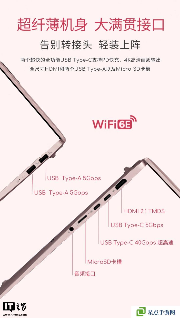 這款筆記本支持Wi-Fi 6E技術(shù),其左側(cè)配備1個(gè)HDMI 2.1接口、1個(gè)USB-C 5Gbps接口、1個(gè)USB-C 40Gbps接口;1個(gè)MicroSD卡槽、1個(gè)3.5mm音頻接口;右側(cè)配備2個(gè)USB-A 5Gbps接口。