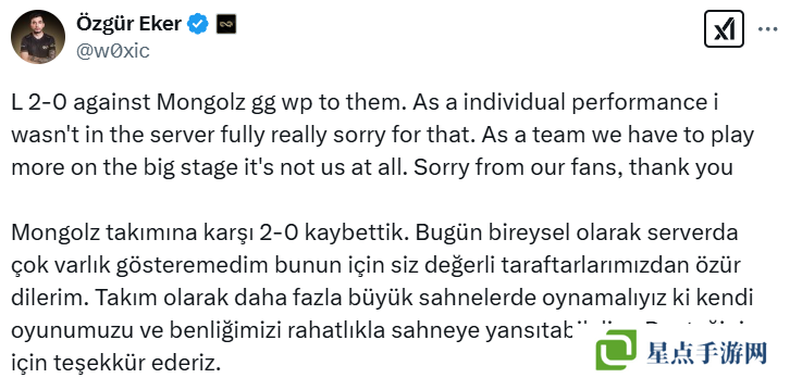 woxic:我們以0-2輸給了The MongolZ。我為今天在比賽中沒有全力以赴而感到抱歉。作為一個團隊,我們需要在重要賽事中表現(xiàn)得更好,今天并沒有打出我們的真實實力。我真誠地向我們的粉絲道歉,并感謝你們的支持。