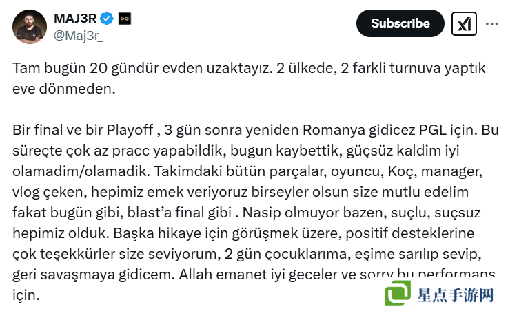 我們經(jīng)歷了一場決賽和一場淘汰賽,三天后我們將前往羅馬尼亞參加PGL。在這段時間里,我們幾乎沒有進行太多的訓練,遺憾的是,今天我們輸了。我的狀態(tài)不佳,表現(xiàn)不理想。團隊的每一位成員——包括選手、教練、經(jīng)理以及記錄我們旅程的人——都在努力實現(xiàn)一些對你們有意義的目標,帶給你們快樂,但像今天這樣的日子,類似于BLAST的決賽,有時就是會發(fā)生。有時候,事情就是不如意,我們都要為此承擔責任,無論是否真的有過錯。