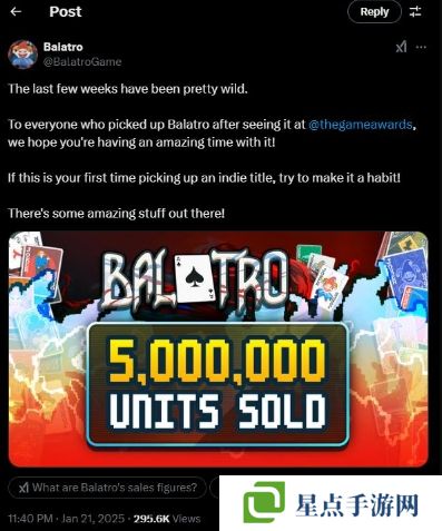 去年熱門的撲克牌主題Rougelite獨立游戲《小丑牌》,近日在官推發(fā)文慶祝,表示游戲已售出超過500萬份。
