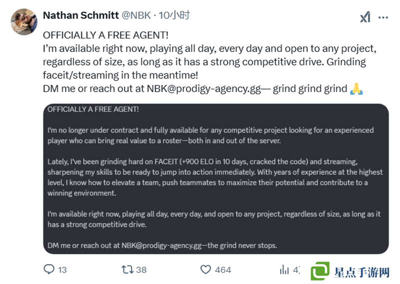 我目前已恢復自由身,我全天都有空打比賽,愿意加入任何戰(zhàn)隊,無論規(guī)模大小,只要有強烈的競爭決心。在此期間,我會在平臺刻苦訓練并進行直播!