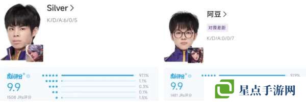 去年年總、挑杯都是KDA發(fā)育路倒數(shù)的silver,在與阿豆搭檔后,首秀對(duì)陣北京JDG一手百里守約直接交出6-0-5、38.4%的完美表現(xiàn)。