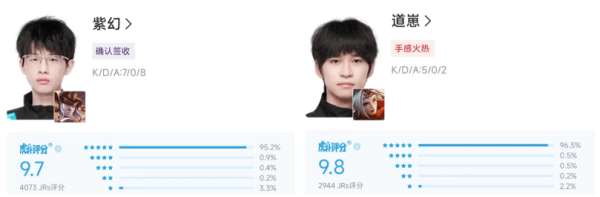 道崽這邊,作為LoveCD帶到狼隊(duì)的第一個(gè)“硬貨”,在本周的發(fā)揮也同樣神勇。對(duì)陣廣州TTG的比賽不必多說,大場比分3-1,但在發(fā)育路的對(duì)位上說道崽4-0風(fēng)簫毫不為過。