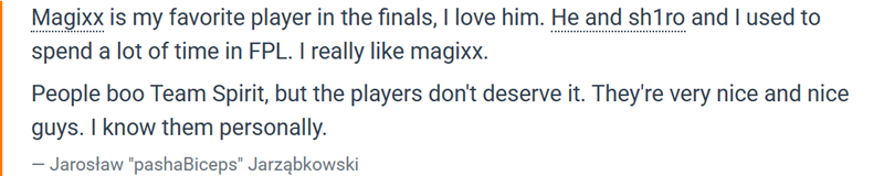 “magixx是決賽中我最喜歡的選手,我喜歡他。他、sh1ro和我以前經(jīng)常一起組隊(duì)打平臺(tái)。我真的很喜歡magixx。