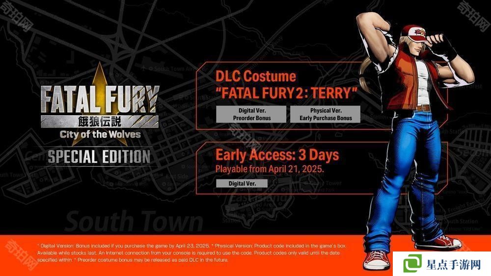 DLC 服裝「餓狼傳說 2:特瑞」重現(xiàn)了特瑞在《餓狼傳說 2》的經(jīng)典造型,將提供給 2025 年 4 月 23 日之前預購數(shù)位版的玩家作為預購特典,以及以兌換代碼的形式附在產(chǎn)品包裝內(nèi)作為實體版的附帶特典。