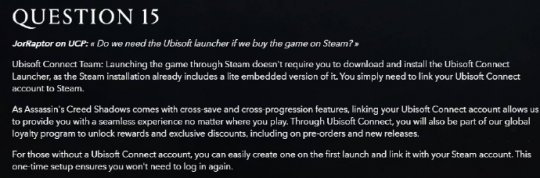 今日,育碧官方在新發(fā)布的QA內(nèi)容中提到,《刺客信條:影》的Steam版啟動時不再需要下載并安裝育碧Connect啟動器,只需在初次游玩時關(guān)聯(lián)Steam和育碧賬號即可游玩,后續(xù)無需再次登陸。 ?